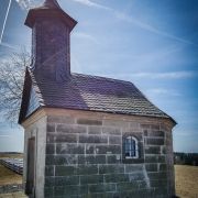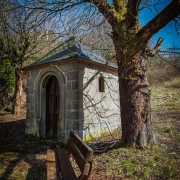 Unten, beim Haus Nr. 30 macht die Straße eine Linkskurve und führt an einer Häuserreihe entlang weiter. Gehen Sie die ganze Häuserreihe entlang. Achtung: 50 Meter bevor der Teerbelag endet, gibt es eine Straßenabzweigung nach rechts unten. Diese führt an eine weitere kleine Kapelle (Bild) – und an der Sie scharf links abbiegen. Hier passieren Sie auch das Ortsausgangs-Schild, das weiter nach Lahm weist. Ab der Kapelle ist der Weg übrigens wieder geschottert.