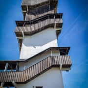 Jetzt sind Sie auf 610 Metern über dem Meeresspiegel und es sind nur noch ein paar hundert Meter bis zum Highlight dieser Tour: der Wasserwarte Birnbaum (geöffnet von Mai bis November). Sie ist ein Turm zur Wasserversorgung des Orts und hat eine Höhe von 32 Metern. Die Aussichtsplattform befindet sich auf 29 Metern Höhe. Genießen Sie den Rundblick über den Frankenwald. Östlich erkennt man den Döbraberg mit seiner kugelförmigen Radar-Kuppel. Nordwestlich sehen Sie – über Baumwipfel hinweg – den Altvaterturm auf dem Wetzstein im Thüringer Wald.