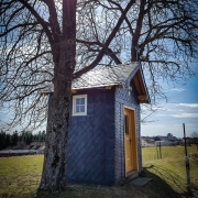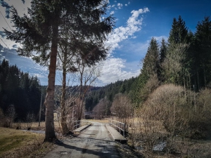Ein Stück nach der Brücke treffen Sie auf eine große Weggabelung. Halten Sie sich hier links und folgen Sie weiterhin dem „Schanzenbinder-Weg“: Kurz darauf folgt eine weitere Weggabelung. Gehen Sie auch hier links auf dem breiten Schotterweg weiter, also nicht den Weg hinunter bzw. hinaus in die Wiesen. Nach etwa einem halben Kilometer sehen Sie dann beim Blick durch die Bäume, rechts unten im Tal die Obere Grümpelmühle. Besonders auffallend sind ihre roten Scheunenwände mit weißen Fensterrändern. Sie wirken fast ein bisschen norwegisch.