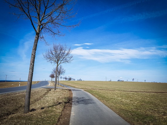 „Ihre“ stille Landstraße mündet nach nur wenigen hundert Metern auf eine weitere Landstraße, der zugleich ein Wanderweg folgt. Aber: Hier müssen Sie nicht am Straßenrand gehen, denn gegenüber führt ein geteerter Rad-/Wanderweg rechts mit etwas Abstand an der Straße entlang. Weiter oben – kurz vor dem Ort Birnbaum – kommen Sie unter anderem an einer kleinen Kapelle (siehe oben im Bildteil) vorbei.Diese Landstraße bietet sich ausnahmsweise deshalb gut an, weil sie einerseits einen Wanderweg „beherbergt“ und andererseits gute Ausblicke garantiert.
