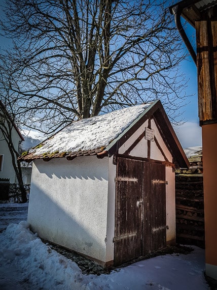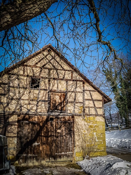 Nach ihm erreichen Sie die breite Hauptstraße, die Sie bitte achtsam überqueren und der Ortsstraße auf ihrer gegenüberliegenden Seite weiter geradeaus folgen. Langsam führt Sie diese Ortsstraße mit leichtem Anstieg zum hinteren Ortsrand, wo sie sich nach dem Ortsschild an einer Scheune gabelt (Bild). Biegen Sie hier ganz nach links oben ab und folgen Sie dem immer noch geteerten Sträßchen, das an einer Hecke entlang führt. Kurz nach dem Abbiegen sehen Sie weit drüben – schräg links hinter sich – das Schloss Greifenstein aufragen, eines der Highlights der HINTERINDIEN.DE–Schloss-Greifensein-Hugoturm-Tour Nr. 7.