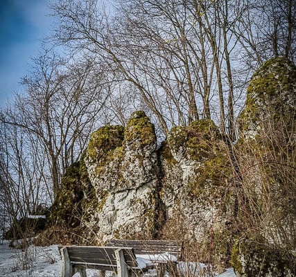 ). Er biegt oben in Linsbühl aber von dieser Route weg. Vorne, rechts oben, sehen Sie auch schon die Häuser vom Linsbühl. Doch bevor Sie aber Linsbühl erreichen, lohnt ein aufmerksamer Blick über Ihre linke Schulter. Denn auf halber Höhe des Weges an der Hecke entlang, türmen sich etwa 50 Meter vom Weg entfernt einige Felsen auf, vor denen eine Sitzgruppe steht. Das ist ein malerischer Platz (siehe oben im Bildteil), den Sie sich für die Sommermonate schon mal vormerken sollten. Tipp: Machen Sie doch einen kurzen Abstecher dorthin und schauen Sie sich dieses schöne Felsen-Ensemble mit Bank näher an! Danach kehren Sie zum geteerten Weg, der hoch nach Linsbühl führt, zurück.