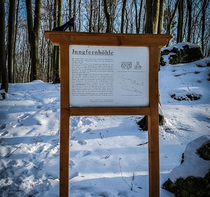 Nach ganz kurzer Zeit erreichen Sie im Wald einige Felsen, an denen Sie rechts vorbei gehen und im Nu sehen Sie eine Infotafel vor der Höhle. Auf der Infotafel wird auf die Geschichte der Höhle eingegangen. Hier finden Sie ausführliche Infos zur Höhle. Wie das Maul eines Haifisches öffnet sich dieses Loch im Wald und erlaubt einen Blick ins Innere. Das Hinabsteigen ist aber wohl eher erfahrenen Kletterern zu empfehlen.
