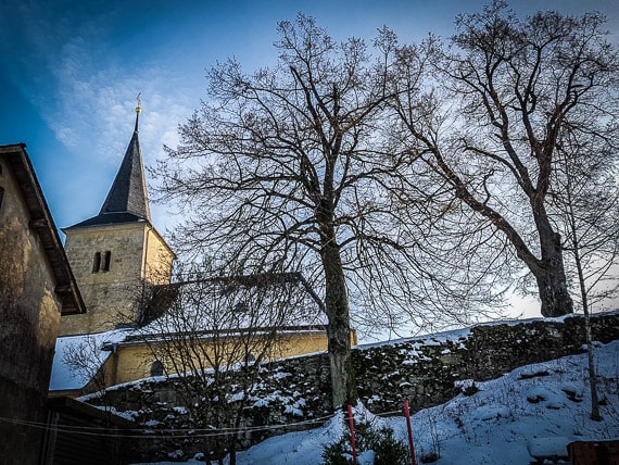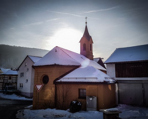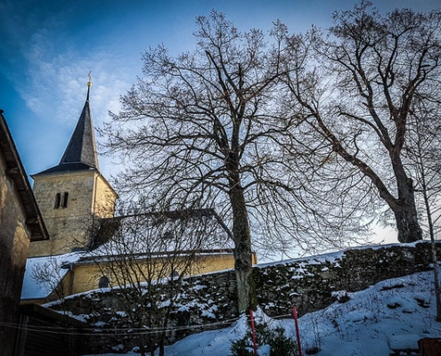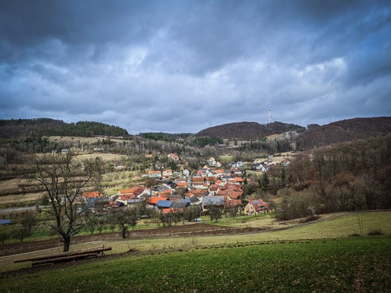 Auf ihrer gegenüberliegenden Seite geht es abermals bergab in den Ort hinein. Immer geradeaus folgen Sie den roten Ringen, u.a. über einen Bach hinweg, bis es an einer T-Kreuzung nur noch links oder rechts geht. Biegen Sie hier nach links in Richtung Kirche ab. Dort biegen Sie nach rechts ab und folgen einfach der Ortsstraße wieder aus dem Dorf hinaus, bis Sie Ihren Wagen am Start- und Zielpunkt dieser Tour erreichen.