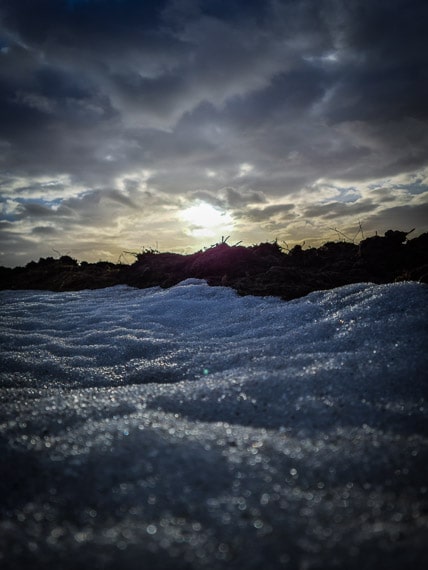 Die Etappe auf der Straße ist nur 400 Meter lang, aber wichtig und sinnvoll für die Wegführung und Orientierung – gerade, wenn es viel geschneit hat. Es geht am Rand dieser Landstraße leicht bergab und Sie lassen alle Windräder hinter sich und rechts von sich stehen.