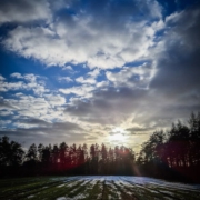 Sobald Sie die Häuser von Linsbühl erreichen, geben Sie bitte Acht! Dort, an einer spitzen Ecke des Waldes teilen sich die Wege: Die schmale, geteerte Straße würde nach rechts führen – und mit ihr auch der Rot-Querbalken-Weg. Lassen Sie diesen jedoch rechts liegen und verlassen Sie die Straße, um genau dem Weg zu folgen, der links am Waldrand entlang führt. Er ist wieder natürlicher und nicht mehr geteert und evtl. auch nicht geräumt. Es kann sein, dass hier nur ein Trampelpfad weiter führt. Er führt nur anfangs leicht bergauf und nach kurzer Zeit mit stetigem Gefälle weiter am Waldrand entlang, der rechts von Ihnen liegt. Linker Hand haben Sie von hier aus einen weiten Ausblick über die Hochebene.