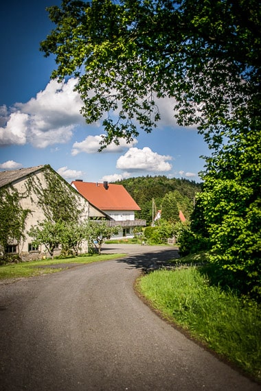 Am Marienturm heißt es wiederum: Aufgepasst! Denn hier ist erst einmal überhaupt kein Wegweiser vorhanden. Biegen Sie hier nach rechts auf die schmale Straße ab, die aus dem Ort hinaus und dabei sanft bergan führt. Nur etwa 150 Meter geht es auf ihr entlang, bis sie schließlich auf eine breite Landstraße mündet. Am Ortsausgangsschild finden Sie dann erst wieder den Wegweiser „E 5“. Biegen Sie hier – dem Wegweiser folgend – auf der Landstraße nach links oben ab.