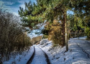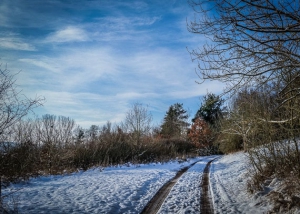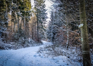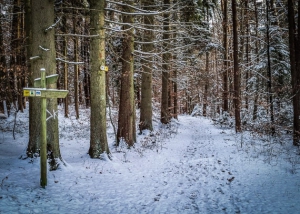 Kurz nach der Johannishof-Einfahrt folgt noch einmal eine Gabelung, an der Sie den Wegweisern folgend rechts auf dem breiten Weg weiter wandern, der nun leicht anzusteigen beginnt. Ab jetzt geht es also spürbar bergauf. Lassen Sie sich hier an kalten Tagen Zeit.