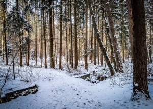 Nach etwa 150 Metern mit ein bisschen auf und ab, beschreibt der Pfad einer Linkskurve und biegt nach links ab. Es geht durch eine flache Senke und dort über einen kleinen Bach hinweg. Auch bei Schnee erkennen Sie diesen an den beiden Öffnungen links und rechts an der kleinen Brücke.