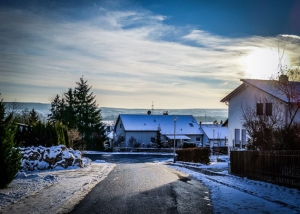 Danach fällt der Weg – von Hecken und Grundstücken umrahmt – steiler bergab. Im Winter kann es hier etwas glatt sein, da viele Familien mit Kindern vor allem mit Schlitten und Skiern unterwegs sind. Das kann den Schneebelag auf der Straße fest drücken und somit glatt werden lassen. Geben Sie hier einfach etwas Acht.