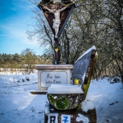 Kurz darauf führt dieser Weg an eine große T-Kreuzung, an der das dritte Kruzifix dieser Tour steht (Bild). Auch eine Sitzbank steht hier an der aus Ihrer Sicht rechten Ecke der Kreuzung. Biegen Sie auf diesem nun wieder breiteren Weg nach rechts ab. Auch das schwarze „R“ des Rennweges ist hier deutlich sichtbar ausgeschildert.