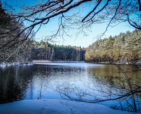 Nur wenige in Franken kennen diesen einsam in den Wäldern gelegenen See: Die Rede ist vom Mönchsweiher (auch Mönchsee genannt). Er befindet sich in der südlichen, auf ein Dreieck zulaufenden Spitze der Haßberge bei Dörfleins und Oberhaid nahe Bamberg. Er ist Ziel der im Januar 2020 aktualisierten HINTERINDIEN.DE-Tour aus 2015. Lernen Sie im Rahmen dieser 9,5 Kilometer langen Wandertour aber noch ein weiteres Highlight kennen: den Kreuzberg bei Bamberg. Von ihm aus bietet sich ein toller Blick auf Bamberg, die Fränkische Schweiz, das Maintal und das Regnitztal Richtung Nürnberg.