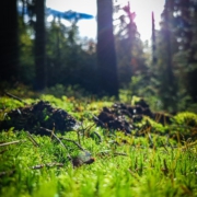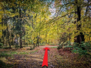 ) dann weiter bergauf. Er überquert eine breite Waldschneise, auf der sich über viele Jahre eine Art „Heide-Landschaft“ gebildet hat. Folgen Sie hier dem Weg einfach immer weiter bergauf. Dabei geht es auch mal über einige Wege hinweg. Das rote „N“ weist Ihnen hier aber immer sicher die Richtung.