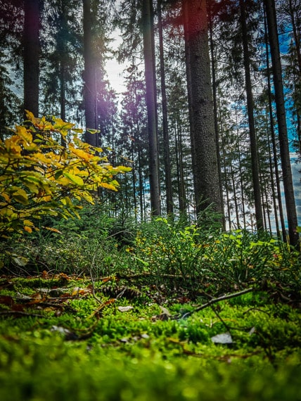 Erst ist der Pfad schmal, dann wird er aber auch wieder breiter (Bild). Alles in allem handelt es sich um einen klassischen Wanderpfad, wie man sich ihn vorstellt. Leicht kurvig und über manche flache Wurzel geht es – immer dem roten „N“ (