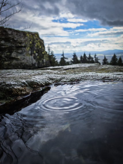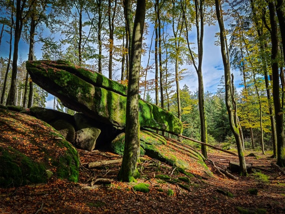 Nachdem Sie den Weg schon fast einen Kilometer weit gewandert sind, treffen Sie auf ein Hinweisschild nach rechts zum „Wackelstein“. Und diese Stein-Ansammlung und -Formation ist auch nicht wirklich zu übersehen. Nur 50 Meter rechts vom Weg türmen sich sichtbar die Felsen auf, die den Eindruck erwecken, einst von Riesen dort angeordnet worden zu sein. Nehmen Sie sich ruhig ein wenig Zeit, um die tonnenschweren Brocken (Bild) zu bestaunen. Der ganz große Brocken obenauf wirkt, als wackele er und fiele tatsächlich gleich herunter.