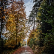 Der Pfad wird immer mehr zum schönen Wandersteig und führt – mal mit leicht felsigem Untergrund, dann wieder als breiter, von Laub überdeckter Weg – die 1,1 km hinunter zur Vorsuchhütte. Dabei überquert er geradewegs (Bild) auch ein paar Forstwege. Er ist mit dem roten „N“ (