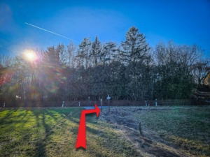 Kurz vor dem Schlossberg mit der Burgstall-Ruine (Hinweis: „Burgstall“ kommt hier vom Wort „Burg-Stelle“) erreichen Sie ein großes Wegdreieck an einem eingezäunten Gelände mit mehreren Hütten. Ab dort wird aus dem Feldweg ein gepflasterter Flurbereinigungs-Weg. Ihm folgen Sie hier am Wegdreieck noch geradeaus weiter.