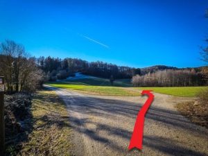 Kurz nach dem Ortsausgangsschild führt ein erster Weg nach links, den Sie aber bitte links liegen lassen. Gleich im Anschluss folgt eine Straßenabzweigung nach rechts (Richtung Dietersberg), die Sie aber rechts liegen lassen. Es geht hier noch ein kurzes Stück geradeaus und sanft bergauf.