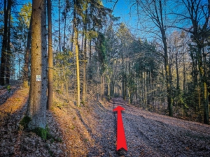 ) ist hier im Wald wieder deutlich und gut sichtbar ausgeschildert. Sie können ihm einfach – mit dem breiten Forstweg – folgen. (Hier im Wald führt auch weiterhin ein blauer Wegweiser mit einem „K“ entlang.)
