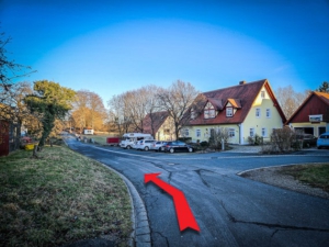 Die Straße, die Sie in den Ort hineinführt, heißt „Egilolfstraße“. Sie führt durch ein Wohngebiet immer leicht bergab. Auf einem kleinen „Platz“ (Bild) vor einem gelben Haus halten Sie sich erst einmal links und folgen der Straße noch ein kurzes Stück.