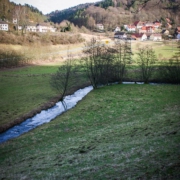 Folgen Sie dem Weg vom Wasserfall aus anschließend weiter am Bachlauf entlang bergan. Dann erreichen Sie mit dem Weg ein deutlich höher gelegenes Tal. Hier oben wird der Weg wieder flacher. Und er führt Sie direkt nach Thuisbrunn. Rechter Hand sehen Sie oben am Berg bei genauem Hinsehen übrigens ein schönes Fachwerkhaus (siehe oben im Bildteil), das von Felsen umringt ist. Dabei handelt es sich um den Egloffsteiner Ortsteil Dietersberg (den Sie mit dieser Tour aber nicht erreichen).