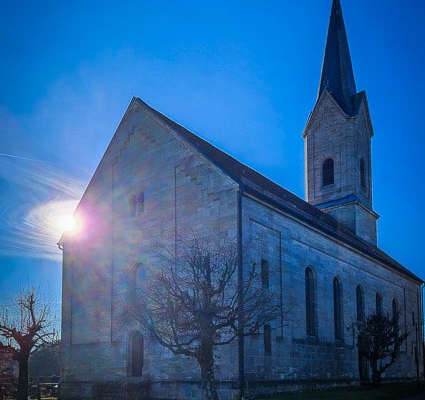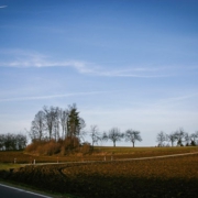 Auf diesem breiten geschotterten Feldweg geht es jetzt immer annähernd geradeaus entlang an einigen Streuobstbeständen vorbei, wie sie in der Fränkischen Schweiz oft vorkommen. Etwa zwei Kilometer lang wandern Sie dann durch diese ebenfalls für die Fränkische Schweiz typische Hochebene, bestehend aus einer schönen Mischung freier Wiesen und Felder, auf die ein erstes kurzes kleines Waldstück folgt, an dem der Weg entlangführt.
