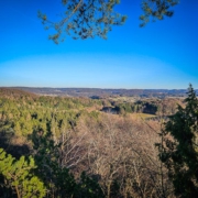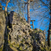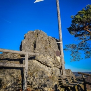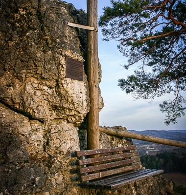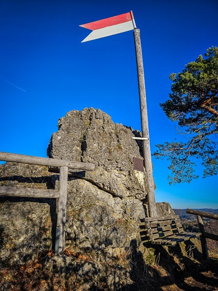 Nach hinten zum höchsten Punkt der Ruine führt ein schmaler, kurviger und felsiger Pfad. Gehen Sie hier bei Schnee oder gar Eis sehr vorsichtig und achten Sie darauf, dass Sie nicht ausrutschen. Stellenweise gibt es auch Holzbrücken, über die der Pfad führt. Am Ende folgt noch einmal ein kurzer, steiler Anstieg – und schon Sie erreichen den höchsten Punkt der Ruine mit Bank und Aussicht (Bild). Genießen Sie die Ausblicke, die sich von hier aus bieten, und ruhen Sie gerne ein wenig aus. Man kann durchaus sagen, dass es sich hier um eine der schönst gelegenen Ruhebänke Frankens handelt.