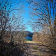 Damit gehen Sie noch einmal über einen sanften Höhenrücken hinweg. Hier wird der Weg auch von einem zweiten, kleinen Waldstück begleitet. (Hier steht links auch eine Hütte.) An der hinteren Ecke dieses Waldstücks folgt nun nach etwa 200 Metern eine Kreuzung (Bild), die erst als Gabelung beginnt (und dann zur Kreuzung wird): Hier würde erneut ein Weg zur Straße führen, diesmal schräg nach links vorne. Lassen Sie auch diesen links liegen. Gehen Sie aber auch NICHT nach rechts an dem dortigen Waldrand entlang. Sondern folgen Sie dem Weg geradeaus – und leicht bergab – und an einem sanften Hang entlang. Links oben sehen Sie vor einem Waldstück weiterhin die Straße und beidseitig „Ihres“ Weges breiten sich Wiesen und Felder aus.