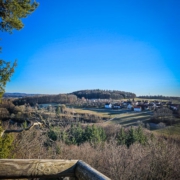 Es geht aber nur kurze Zeit steil bergauf. Schon nach etwa 100 Metern treffen Sie oben schon wieder auf einen Wegweiser. Ab da führt der Pfad als Wiesen-Pfad geradeaus an der Hecke entlang weiter. (Sie können aber vom Wegweiser aus einmal kurz einen Abstecher nach rechts oben machen – wenige Meter reichen schon aus – und Sie haben noch einmal einen schönen Ausblick auf den Ort und die Burg). Im Anschluss geht es aber geradeaus, dem grünen Ring (