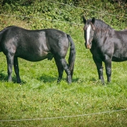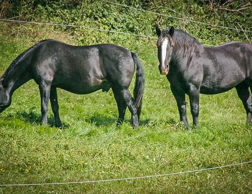 ) erneut nach links. Nun wandern Sie hinaus auf eine weite ebene Fläche. Rechts stehen einige Streuobstbäume am Rande einer großen Pferdekoppel. Sicherlich wird es keine Einwände geben, wenn Sie sich einen Apfel gönnen. Der breite, geschotterte Weg führt Sie geradeaus in Richtung Waldrand und in einen Wald hinein.