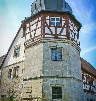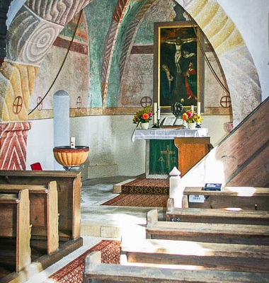 Nach etwa 1 ½ Kilometern öffnet sich der Wald und Sie sehen den Ort Kästel mit seiner markanten alten Wehrkirche. Gehen Sie immer geradeaus auf den Ort zu. Bei den ersten Häusern angekommen, halten Sie sich einfach rechts und gehen in die Ortsmitte bis zur Kirche. An der Kirche treffen Sie auf eine nach links bergab führende Straße, auf der Sie später dann nach links unten abbiegen. Vorher lohnt sich allerdings ein Blick in die alte Wehrkirche. Sie ist nicht riesengroß, hat aber dennoch mehrere Emporen. Kunstgeschichtlich bedeutsam sind die bei einer Renovierung wieder freigelegten alten Fresken im Altarraum.