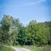 Im Wald wird der Weg wieder naturbelassener und ist nicht mehr geschottert. Nun geht es leicht bergauf. Auch hier ist der Gelb-Querbalken-Wegweiser immer gut sichtbar angebracht. Nach einer sanften Steigung und einer leichten Linkskurve von den Weihern weg, geht es an einer Gabelung nach rechts weiter. Auf einem Pfad geht es jetzt ein Stück entlang, und dann geradeaus wieder aus dem lichten Wald hinaus. Außen treffen Sie – wie sollte es hier anders sein – wieder auf kleine Karpfenteiche. Geradeaus geht es am Waldrand weiter. Vorne sehen Sie eine kleine Landstraße. Auf diese hält der Weg direkt zu.