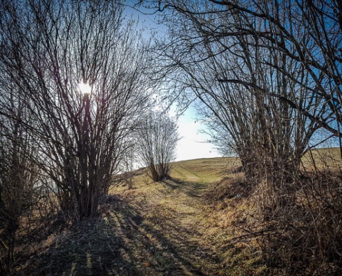 Er führt Sie erst an einer Hecke entlang, dann immer mehr durch die Hecken, macht dabei einen Rechts- und einen Linksbogen, um dann immer wieder an Streuobst-Wiesen vorbei am Berg entlang zu gehen. Und linker Hand zeigt sich ab und an immer wieder die felsige Gipfelkante durchs Gebüsch.