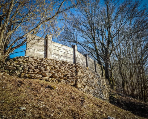 Nachdem Sie viel gesehen haben, wandern Sie weiter in die Senke zwischen dem Rodenstein und dem Walberla. Jetzt können Sie auch „drüben“ auf dem Walberla-Sattel schon die kleine Ehrenbürg-Kapelle sehen. Mitten in der Senke kommen Sie am linken Wegesrand an einer restaurierten keltischen Mauer- bzw. Wall-Anlage vorbei. Auf mehreren Informationstafeln erfahren Sie Näheres dazu.
