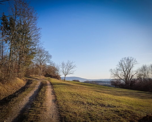 Dann erreichen Sie den Ortsrand, ab dem die Straße nun zum geschotterten Weg wird. An Tagen mit gutem Frühlingswetter kann Ihnen jetzt schon eine eine stattliche Anzahl von Wanderern begegnen, da das Walberla ein sehr bekanntes und beliebtes Wanderziel ist.Der Schotterweg steigt – rechts und links von Streuobstwiesen umringt – bergan. Von nun an geht’s bergauf. Doch vorher erreichen Sie noch einen Wanderparkplatz, auf dem Sie sich links halten. Denn nach links oben – an einem Keller vorbei – führt der Weg nun an der Südseite des Walberla-Rodenstein-Massivs deutlich bergauf.