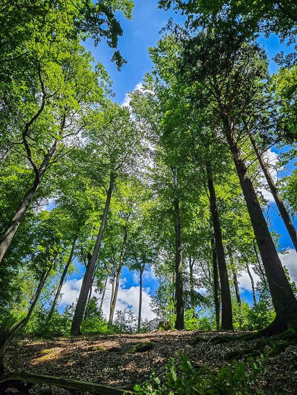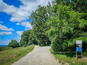 Jetzt folgt der letzte Anstieg hoch zur Steglitz. Und ja, es geht noch einmal steil hinauf – doch zum Glück ist der Anstieg von der Strecke her nicht sehr weit. Auf Dreiviertelhöhe kommen Sie dann noch an einer Informationstafel zu den Spuren der keltischen Besiedelung des Berges vorbei. Danach geht es noch einmal kurz ganz steil hinauf. Sobald Sie das 441 Meter hohe Plateau, die sogenannte „Burgstall“ (von „Burgstelle“ hergeleitet) erreichen, können Sie unter einem dichten Blätterdach eine verdiente Verschnaufpause machen. Im Sommer schützen Sie die Bäume hier gut vor der heißen Sonne. (Von weitem sieht man die Steglitz übrigens als richtig runde Bergkuppe, die gleich neben den Banzer Bergen aufragt.)