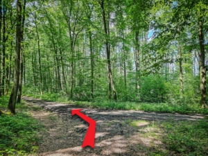 Kurz nachdem Sie im Wald angekommen sind, treffen Sie auch schon auf ein großes Wegdreieck (Bild) mit „Verkehrsinsel“. Gleich vorne an dieser „Verkehrsinsel“, an der ein breiter Weg nach rechts und bergauf führt, auch ein schwarz-weißer Kloster-Langheim-Wegweiser. Biegen Sie hier also nach rechts ab.
