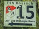 Am Ende erreichen Sie schließlich eine „finale“ Ecke des Waldes: Dort ist eine Wegkreuzung und Sie sehen mehrere Wegweiser. Biegen Sie hier im rechten Winkel nach links in den Wald zur Steglitz ab, die hier auch angeschrieben ist. Als Wegweiser (Bild) sehen Sie unter anderem einen gelben mit einer Vase, auf der ein Ammonit-Symbol zu sehen ist – und der Buchstabe „A“. Zusätzlich gibt es einen weißen Wegweiser mit der Zahl „15“ und dem Wappen des TSV Rossach.