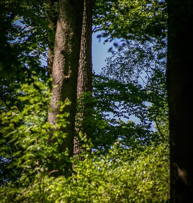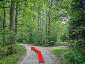 ). Oben am Waldeingang gabelt sich der Weg. Gehen Sie hier nach links in den Wald hinein. (Sie können selbstverständlich einen Abstecher nach rechts oben zum Waldklettergarten machen, der sich jedoch für einen Extrabesuch eignet.