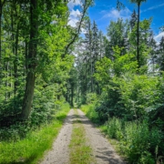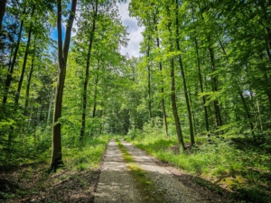 ) – auf einen wieder etwas breiteren Forstweg (Bild). Biegen Sie hier nach links ab, wobei dieser Weg im Wald dann noch einmal ganz sanft ansteigt.