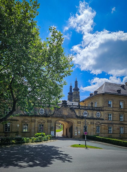 Nach ca. 300 Metern am Waldrand entlang öffnet sich dann auch der Blick dann auch nach links: Jetzt sehen Sie links oben vor sich auf dem Bergrücken Kloster Banz in voller Pracht. Von hier unten zeigt sich die große Anlage fast noch besser als vom Parkplatz oben. (Das Kloster beherbergt heute neben der „Hanns-Seidel-Stiftung“ unter anderem auch eine sogenannte Petrefaktensammlung, die zahlreiche Exponate wie beispielsweise ägyptische Mumien.)