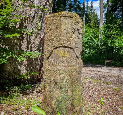 Nach den etwa 1 ¼ Kilometer (und dem schon genannten Weg, der von links unten kommt und „Ihren“ breiten Schotterweg schräg überquert, kommen Sie an die Abzweigung „Rote Marter“, an der – vorne vor dem Baum – auch wieder ein historischer Stein steht (siehe oben im Bildteil). Es ist ein alter, restaurierter Grenzstein, dessen Aufschrift wieder gut lesbar ist. Auf ihm zeigt eine gelbe Hand nach „Altenbanz“. Biegen Sie also auf dem großen Forstweg nach links in Richtung Altenbanz ab.