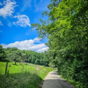 Ihr Weg führt anschließend an einer Hecke entlang immer geradeaus. Achtung: An einer Schotterweg-Gabelung bitte nach rechts gehen. Dann fällt der Weg langsam bergab, bis Sie eine schmale geteerte Straße erreichen.