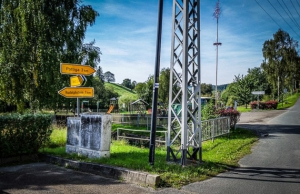 Oben auf der Höhe angelangt, wird die schmale Straße wieder eben. Das „Blaue-Kammweg“-Symbol zeigt sich hier vorerst nicht. Achten Sie oben links am Wegesrand auf einen alten, halb zerfallenen Kreuzstein. An ihm biegt Ihr Weg nach links an einem eingezäunten Grundstück entlang in Richtung Wald ab. Sie verlassen also die geteerte Straße. Der „Blaue-Kamm“-Wegweiser ist dort nicht vorhanden. Achten Sie bitte deshalb auf das Steinkreuz. Ein Stück weit ist dieser Weg leicht verwildert, doch im Herbst legt sich das Gras.