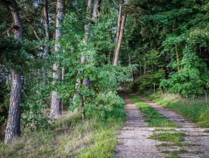 Auf dieser neuen, schmalen Teerstraße geht es ein weites Stück am Waldrand entlang immer geradeaus. Noch recht neu ist hier auch eine breite Landstraße, die „Ihr“ Weg jetzt geradewegs überschreitet. Benutzen Sie hier links den Fahrrad-Umgehungsweg, um die breite Landstraße sicher zu überqueren. Auf ihrer gegenüberliegender Seite geht es dann wieder weiter am selben Waldrand entlang geradeaus. Die Wegweiser werden wieder spärlicher, sind aber vorhanden. Ihr Weg führt immer geradeaus (also nicht zum Rondell), bis der Weg dann in den Wald hinein führt.