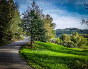 Nun gehen Sie mit dem Weg geradeaus in den Wald hinein, der sich an einem Hang entlang zieht. Ein Verlaufen ist hier quasi nicht möglich. Bei der Gabelung im Wald folgen Sie dem linken Weg, der NICHT bergan steigt. Immer weiter in ziemlich gerader Richtung führt er dann leicht bergab und mündet auf eine Ortsverbindungsstraße. Biegen Sie hier mit Vorsicht auf den Verkehr nach links unten ab. Mit der Straße überqueren Sie übrigens einen kleinen, sich im Tal herab schlängelnden Bachlauf.
