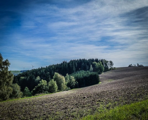 Sie gelangen nun auf eine Art Hochebene, von der sich bereits schöne Aussichten eröffnen. Doch ist hier oben kein Wegweiser zu sehen. Zum Glück müssen Sie nur – ganz oben auf dem Plateau – auf einen Weg achten, der im rechten Winkel nach rechts abbiegt. Nach kurzer Zeit führt auch er (links) an einer Hecke entlang erneut bergauf. Hier können Sie direkt hinüber nach Franken blicken: Die Nordflanke des Frankenwaldes zieht sich hier entlang und wird vom 795 Meter hohen Döbraberg gekrönt.