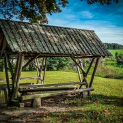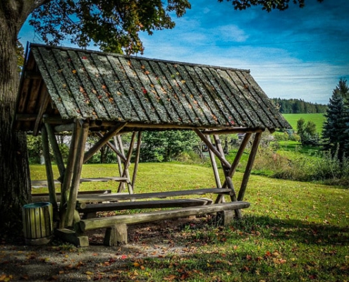 Nach einiger Zeit kommen Sie an einer überdachten, alten Holzbank-Sitzgruppe vorbei und folgen mit der Straße einer scharfen Rechtskurve an einer Waldlichtung. Danach fällt die Straße talwärts und Sie laufen auf Flusshöhe parallel zur Saale, die unweit rechts von Ihnen fließt. Nun geht es das letzte Stück geradeaus, bis Sie wieder Sparnberg erreichen. Wandern Sie auch dort weiter geradeaus, bis Sie im Ort wieder unten an den Parkplatz, den Start- und Zielpunkt dieser Tour, gelangen.