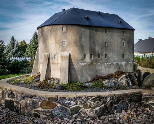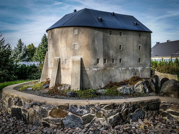 Vor der eigentlichen Burg steht ein aufwändig gestaltetes Modell der alten Burg (Bild), das sehr beeindruckend ist. Alte Mauern ragen auf und sogar ein altes Kellergewölbe öffnet sich am Boden. Und: Man kann hier über steile Abgünde ins tief unten liegende Saaletal blicken. Es gibt hier noch einen kleinen Extra-Rundweg zu einem Aussichtspunkt – aufgrund der Länge dieser HINTERINDIEN.DE-Tour würde er aber den Rahmen sprengen. Sie können selbst entscheiden, ob sie ihn zusätzlich gehen möchten.