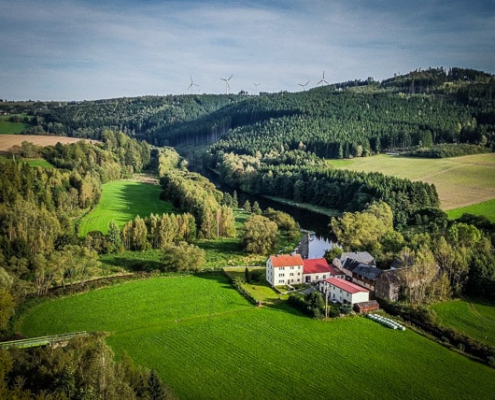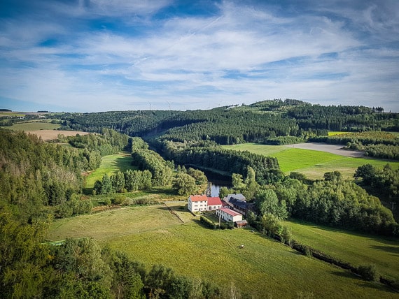 Nach der schönen „Hochebene-Etappe“ erreichen Sie, während der Weg schon bergab fällt, ein kleines Wäldchen. Auch den Ort Blankenberg haben Sie hier schon vor Augen, sein Kirchturm ragt deutlich empor. An der linken Flanke des Wäldchens führt der Weg an einer Hecke entlang und knickt dann an seinem unteren Ende im rechten Winkel nach rechts ab. Unterhalb führt auch eine große Landstraße vorbei. Um sie müssen Sie sich jedoch nicht kümmern, sondern biegen über die Brücke, die sich am anderen Ende des Wäldchens befindet, nach links über die Straße hinweg ab.